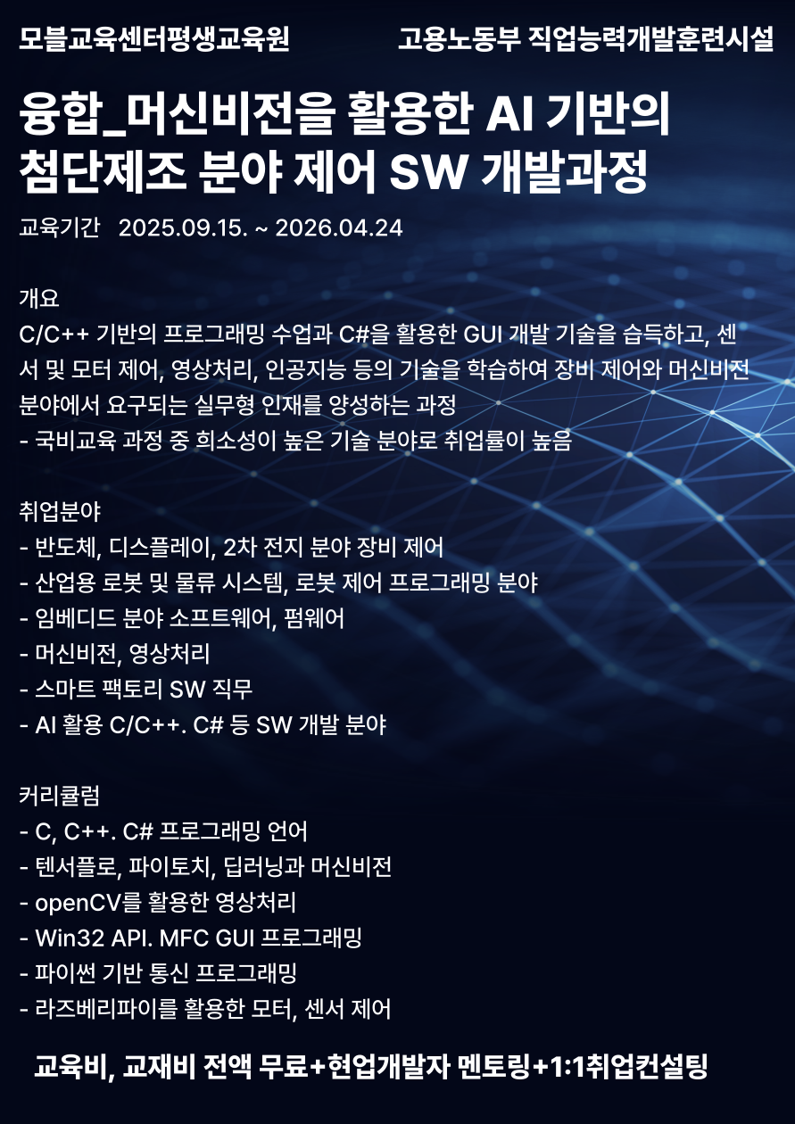 본 교육은 고용노동부 HRD-Net의 위탁사업으로 전액무료로 C, C++, C# 등의 언어들을 습득하여 컴퓨터가 인간의 지적 업무를 대행할 수 있도록 S/W시스템 개발, 임베디드 시스템을 구축, 구현등 AI기술 전문 분야 인재 양성하는 과정입니다.